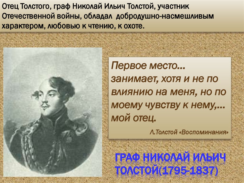 Отец Толстого, граф Николай Ильич Толстой, участникОтечественной войны, обладал добродушно-насмешливым