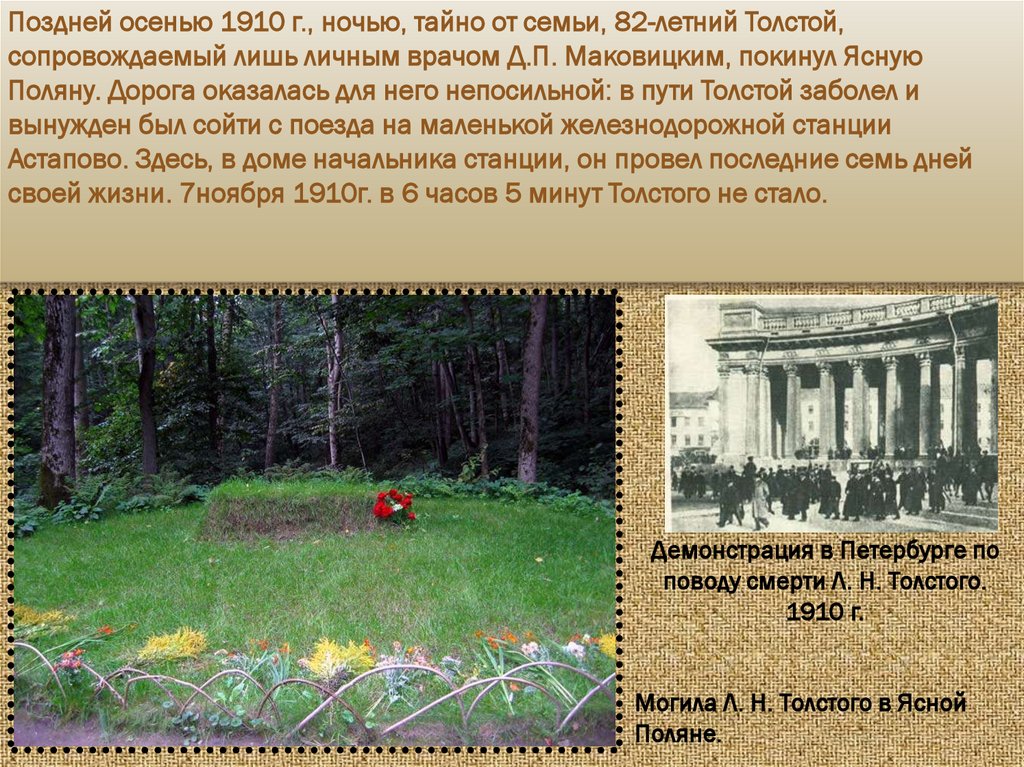Поздней осенью 1910 г., ночью, тайно от семьи, 82-летний Толстой,сопровождаемый лишь личным врачом Д.П. Маковицким, покинул Ясную