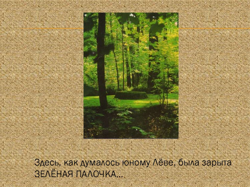Здесь, как думалось юному Лёве, была зарытаЗЕЛЁНАЯ ПАЛОЧКА…