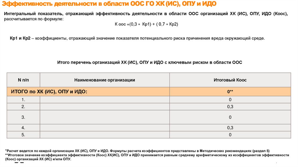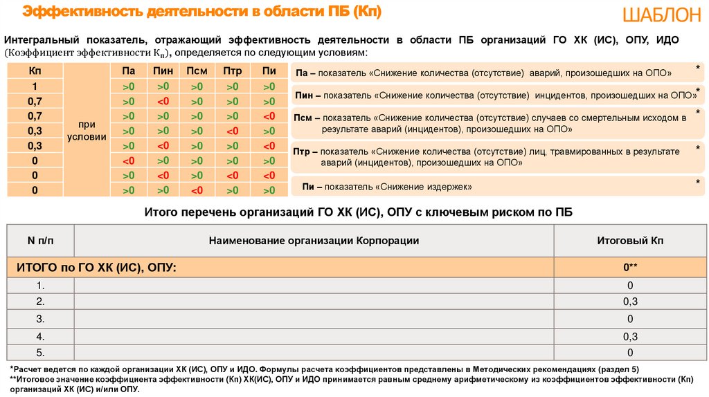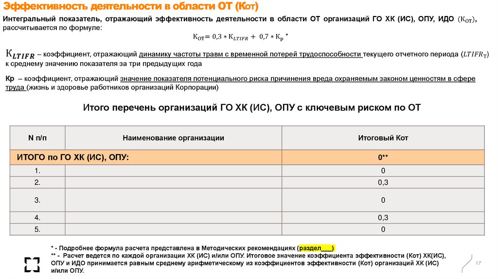 Эффективность деятельности в области ОТ (КОТ)Интегральный показатель, отражающий эффективность деятельности в области ОТ организаций ГО ХК (ИС), ОПУ, ИДО (КОТ),