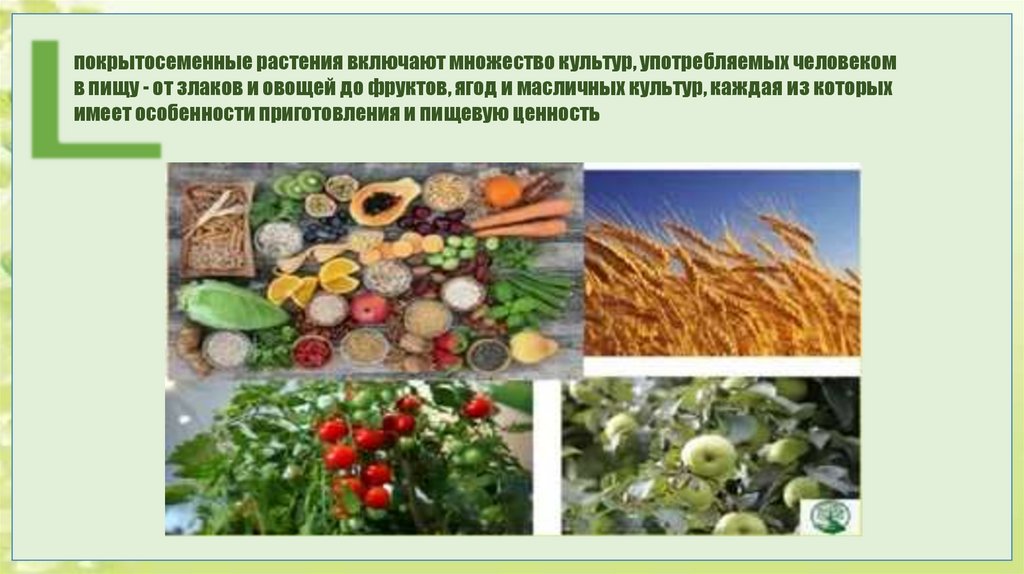 покрытосеменные растения включают множество культур, употребляемых человекомв пищу - от злаков и овощей до фруктов, ягод и масличных культур, каждая из которых