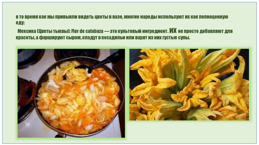 Мексика (Цветы тыквы): Flor de calabaza — это культовый ингредиент. их не просто добавляют для