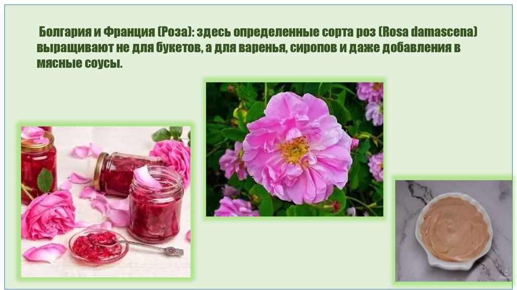 Болгария и Франция (Роза): здесь определенные сорта роз (Rosa damascena)выращивают не для букетов, а для варенья, сиропов и даже добавления в