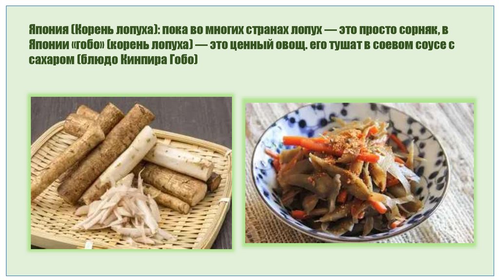 Япония (Корень лопуха): пока во многих странах лопух — это просто сорняк, вЯпонии «гобо» (корень лопуха) — это ценный овощ. его тушат в соевом соусе с