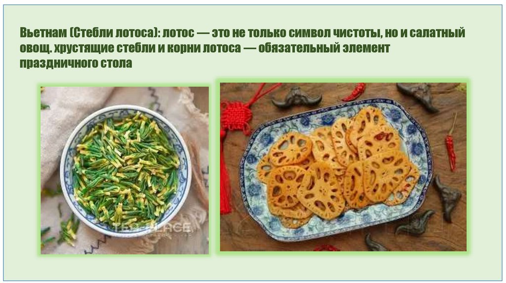 Вьетнам (Стебли лотоса): лотос — это не только символ чистоты, но и салатныйовощ. хрустящие стебли и корни лотоса — обязательный элемент