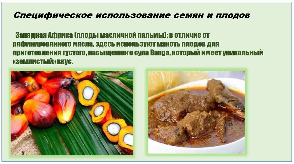 Специфическое использование семян и плодовЗападная Африка (плоды масличной пальмы): в отличие от