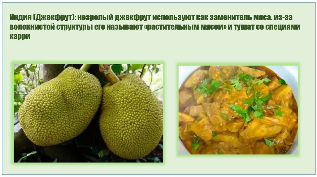 Индия (Джекфрут): незрелый джекфрут используют как заменитель мяса. из-заволокнистой структуры его называют «растительным мясом» и тушат со специями