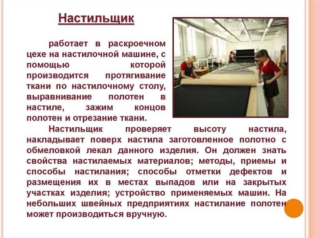 НА ШВЕЙНЫХ ПРЕДПРИЯТИЯХ РАБОТАЮТЛЮДИ РАЗНЫХ ПРОФЕССИЙ:
