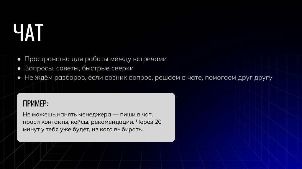 ● Не ждём разборов, если возник вопрос, решаем в чате, помогаем друг другу