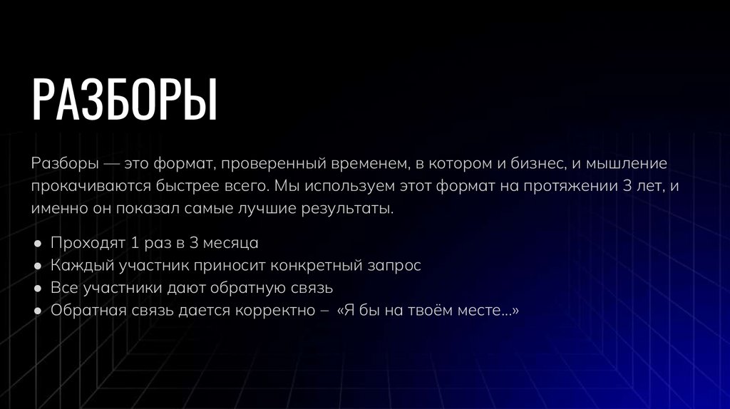 РАЗБОРЫРазборы — это формат, проверенный временем, в котором и бизнес, и мышление