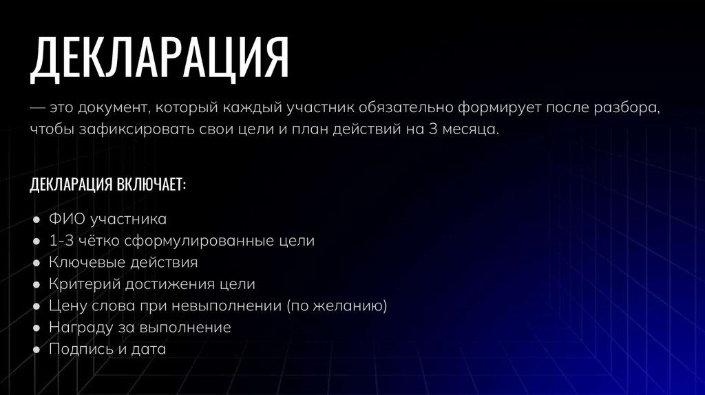 ДЕКЛАРАЦИЯ— это документ, который каждый участник обязательно формирует после разбора,