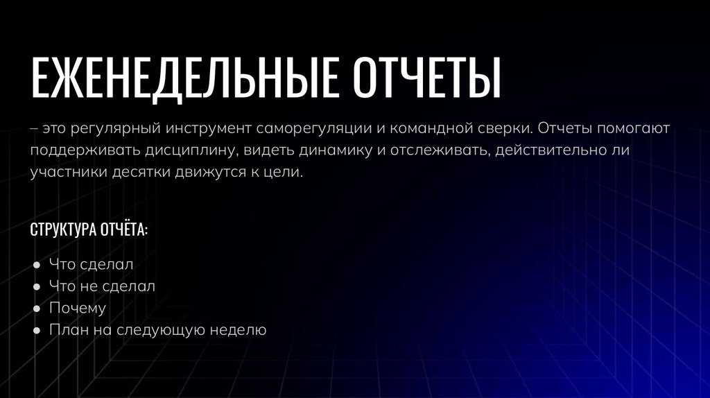 ЕЖЕНЕДЕЛЬНЫЕ ОТЧЕТЫ– это регулярный инструмент саморегуляции и командной сверки. Отчеты помогают