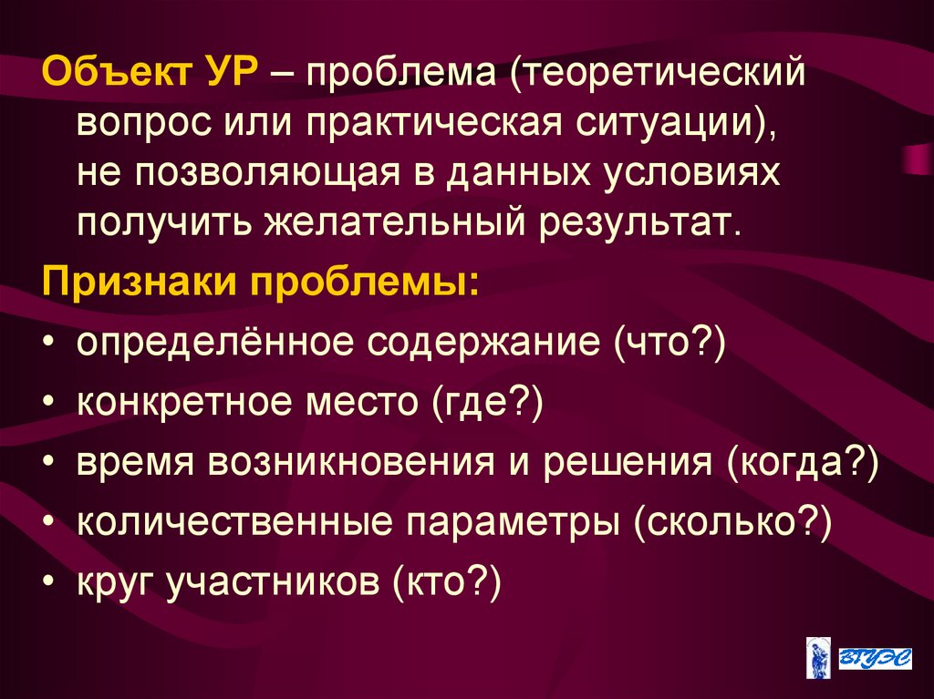 Объект УР – проблема (теоретическийвопрос или практическая ситуации),