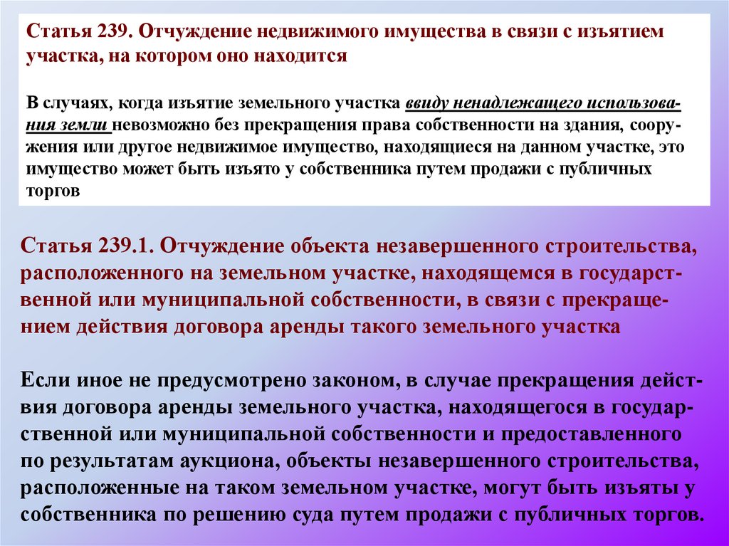 13. Статья 239.2 Отчуждение недвижимого имущества в связи с изъятием участка, на котором оно находится для государственных или