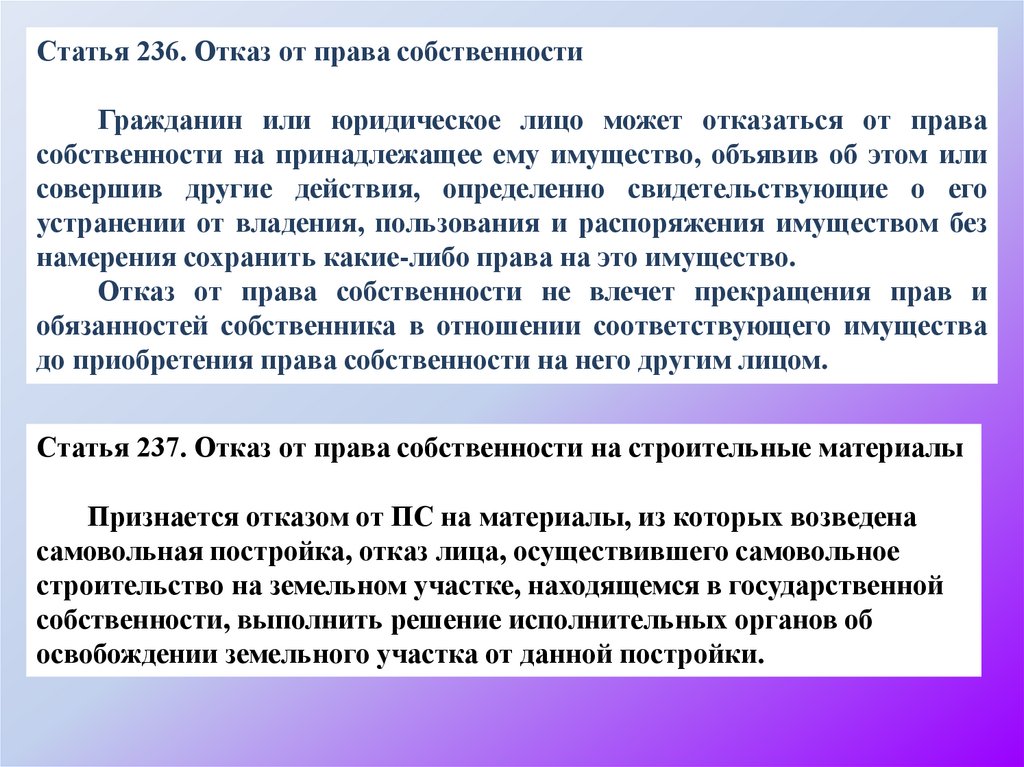 Статья 236. Отказ от права собственностиГражданин или юридическое лицо может отказаться от права