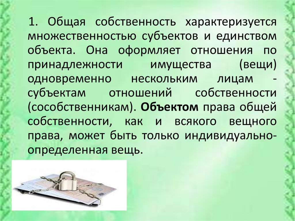 1. Общая собственность характеризуетсямножественностью субъектов и единством