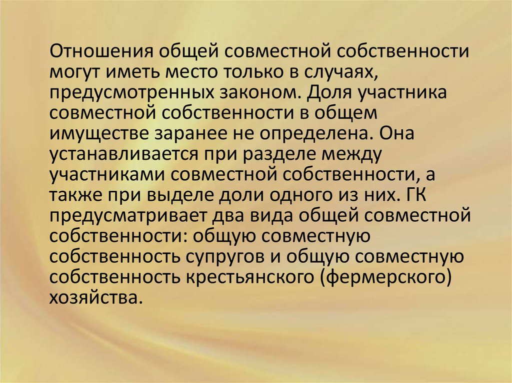 Отношения общей совместной собственностимогут иметь место только в случаях,