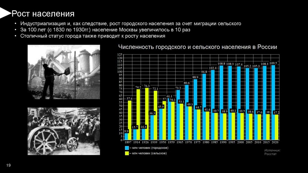 Рост населения• Индустриализация и, как следствие, рост городского населения за счет миграции сельского