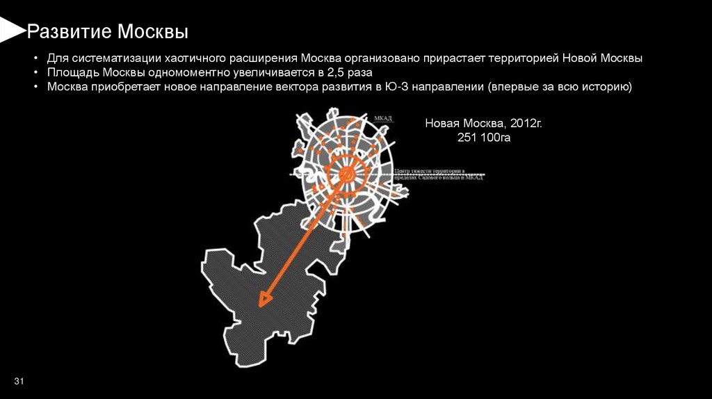 Развитие Москвы• Для систематизации хаотичного расширения Москва организовано прирастает территорией Новой Москвы