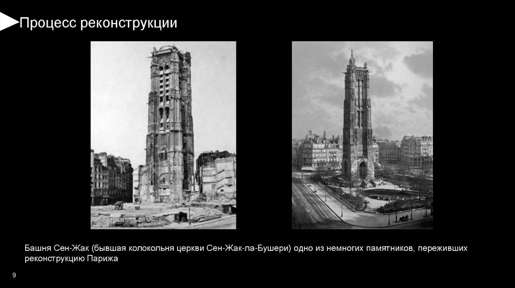 Процесс реконструкцииБашня Сен-Жак (бывшая колокольня церкви Сен-Жак-ла-Бушери) одно из немногих памятников, переживших