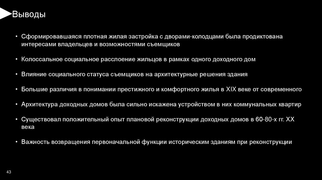 Выводы• Сформировавшаяся плотная жилая застройка с дворами-колодцами была продиктована
