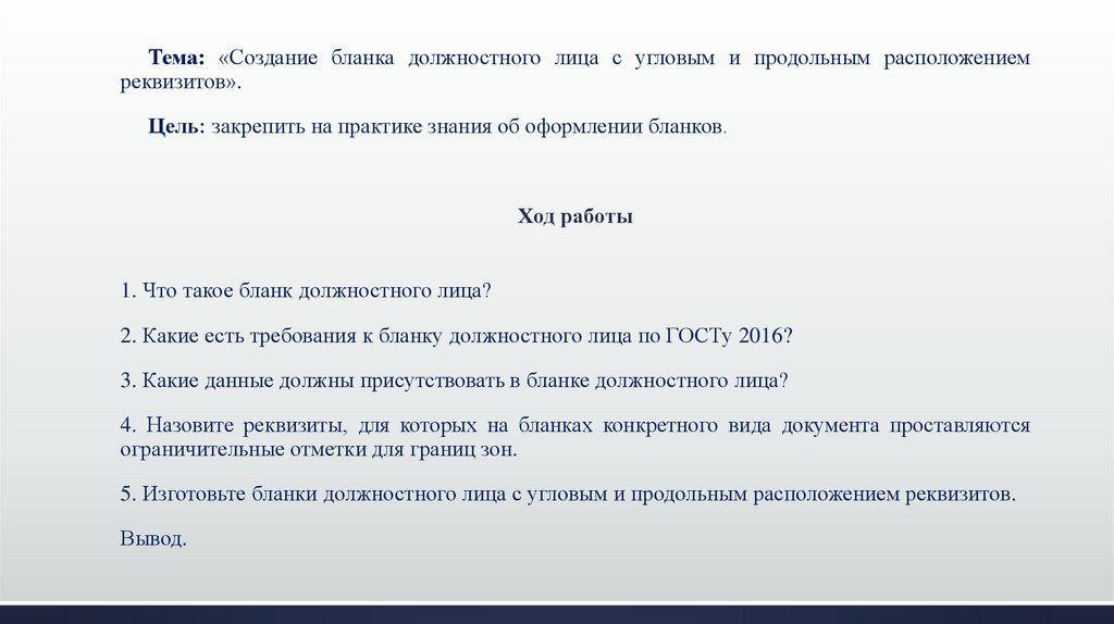 Тема: «Создание бланка должностного лица с угловым и продольным расположениемреквизитов».