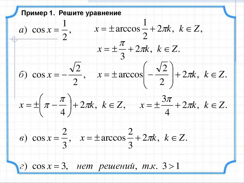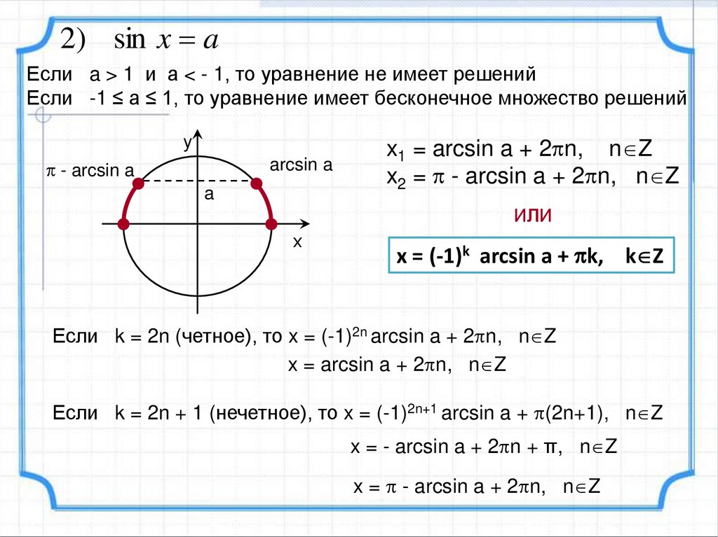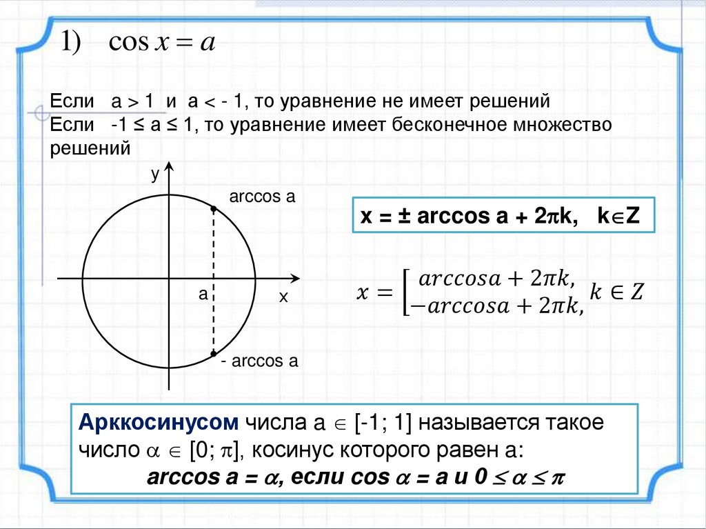 1) cos x aЕсли a > 1 и а < - 1, то уравнение не имеет решений