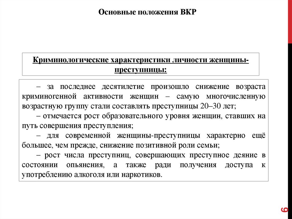 Основные положения ВКРКриминологические характеристики личности женщиныпреступницы: