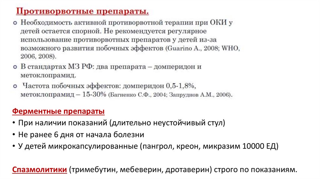 противорвотные, спазмолитики, ферментные препараты.