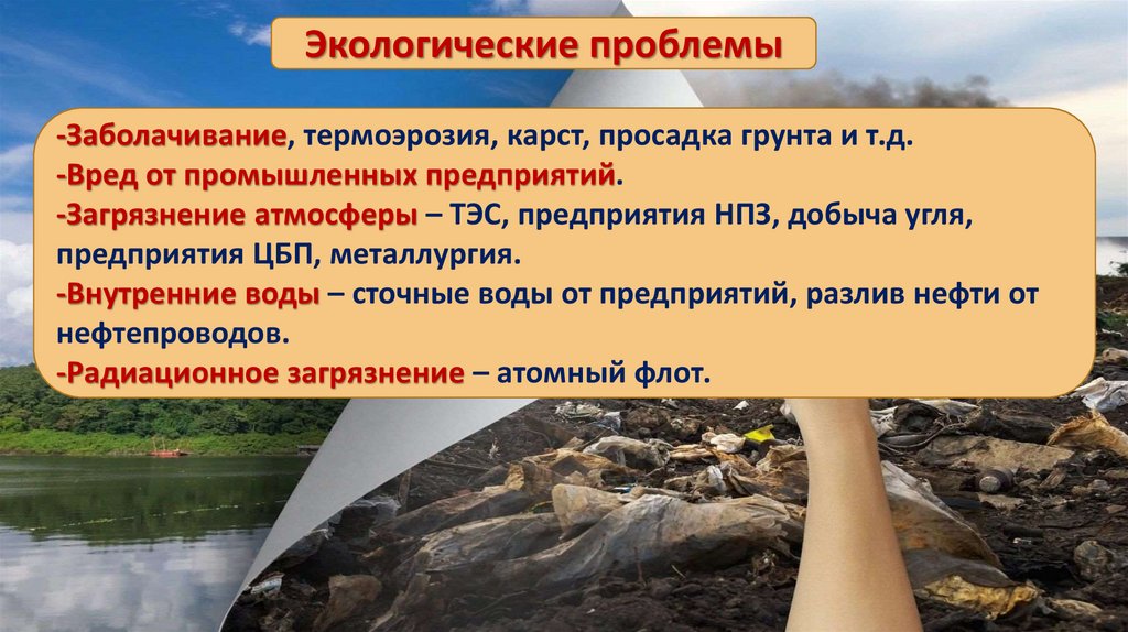 Экологические проблемы-Заболачивание, термоэрозия, карст, просадка грунта и т.д.