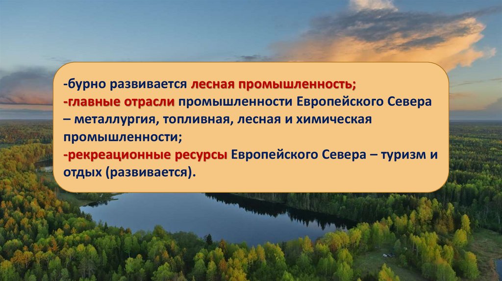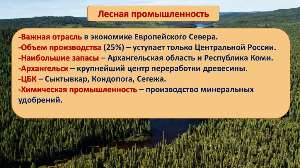 -бурно развивается лесная промышленность;-главные отрасли промышленности Европейского Севера