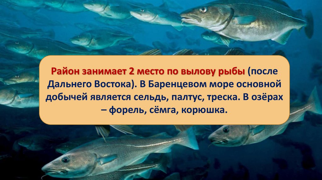 Район занимает 2 место по вылову рыбы (послеДальнего Востока). В Баренцевом море основной