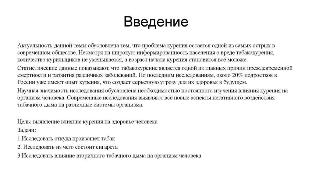 ВведениеАктуальность-данной темы обусловлена тем, что проблема курения остается одной из самых острых в