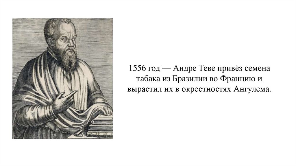 1556 год — Андре Теве привёз семенатабака из Бразилии во Францию и