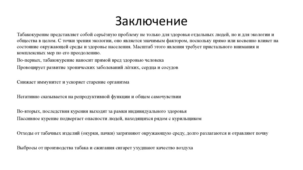 ЗаключениеТабакокурение представляет собой серьёзную проблему не только для здоровья отдельных людей, но и для экологии и