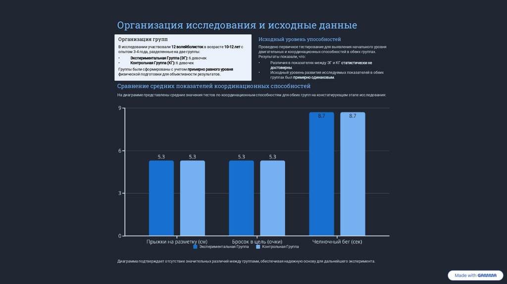На диаграмме представлены средние значения тестов по координационным способностям для обеих групп на констатирующем этапе исследования: