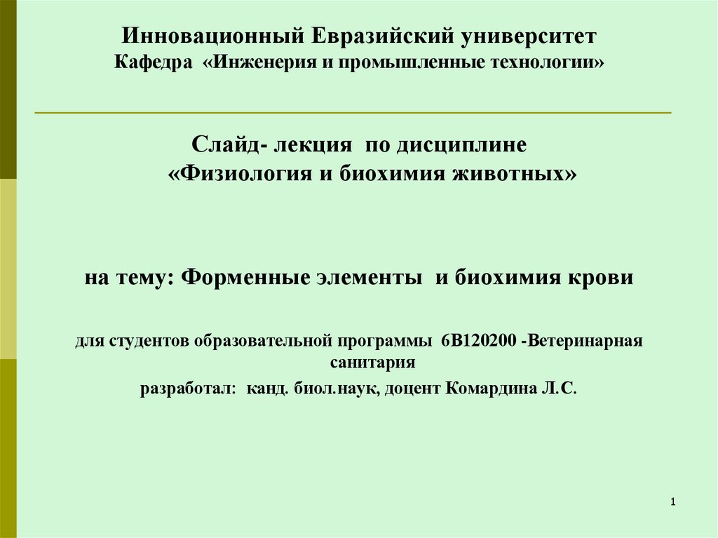 1. Инновационный Евразийский университет Кафедра «Инженерия и промышленные технологии»