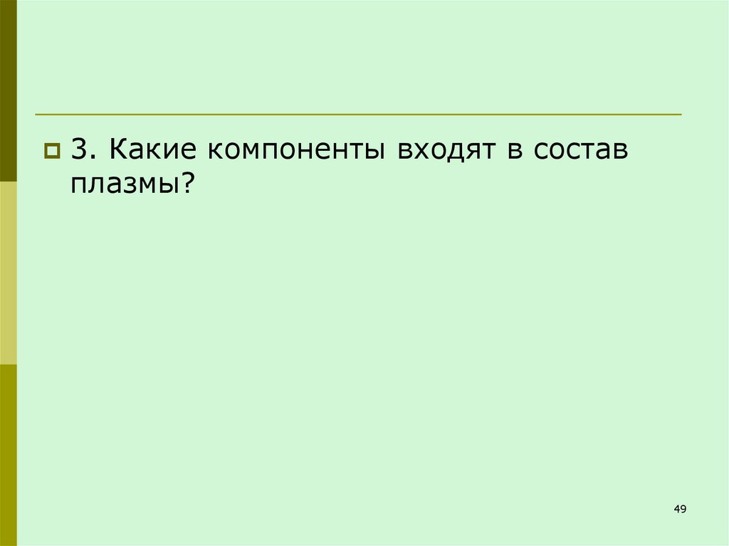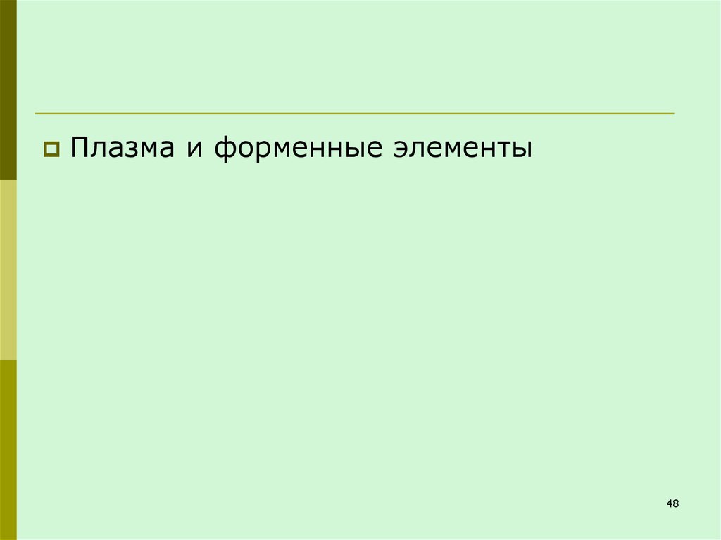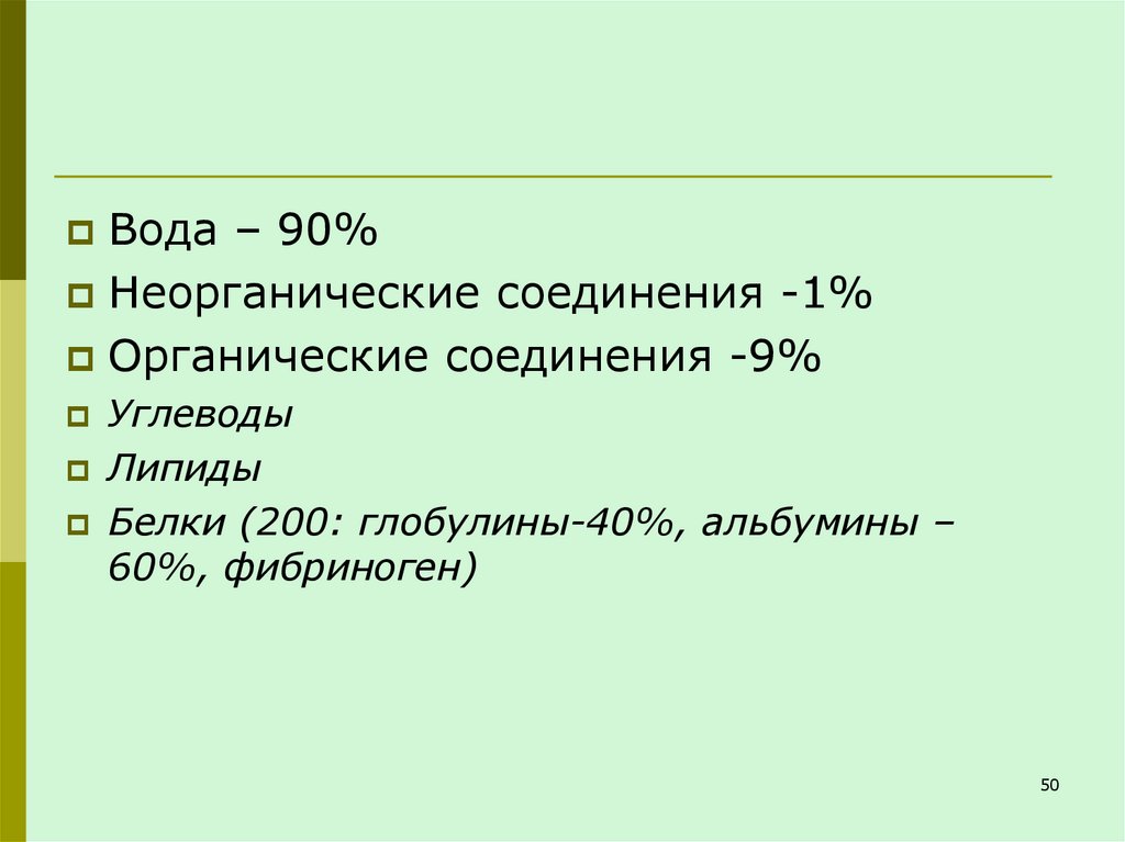 Плазма – полупрозрачная жидкость желтоватого цветас вязкостью 1,7-2,2, относительной плотностью 1,0301,035. Содержит в среднем 91% воды и 9% сухого