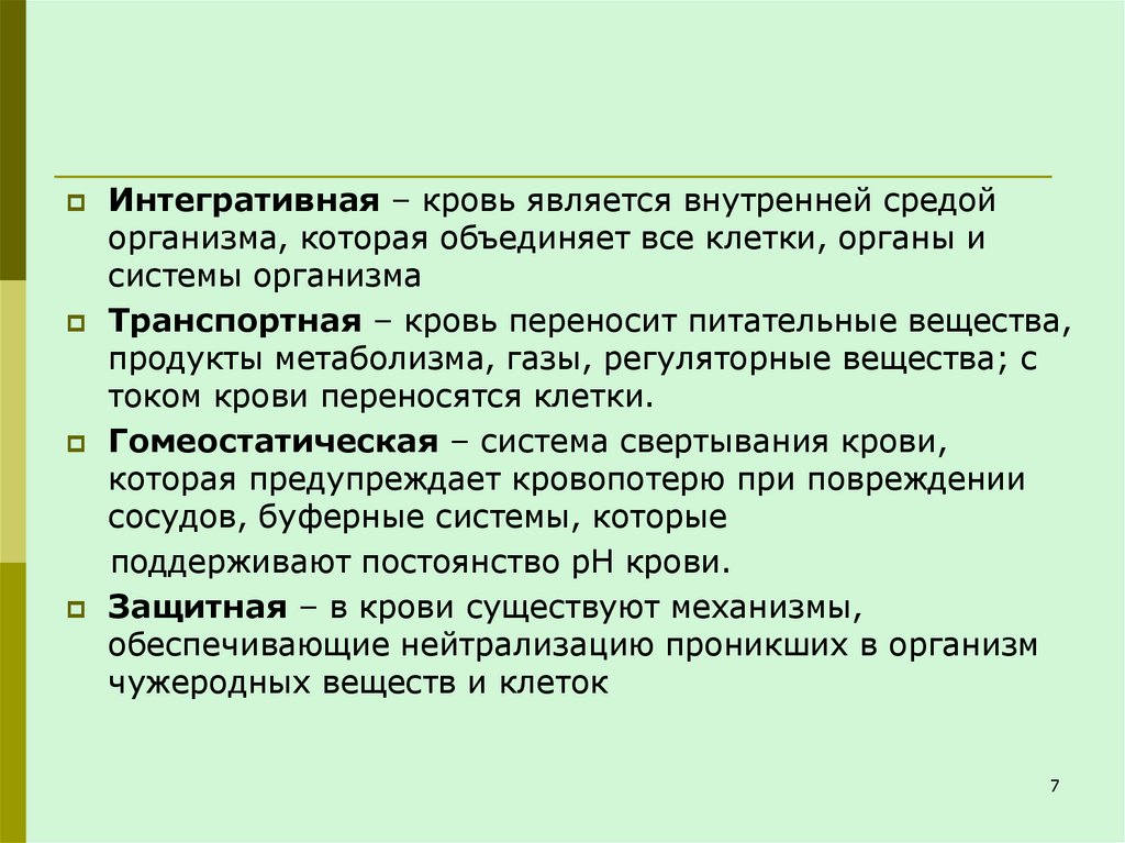 Интегративная – кровь является внутренней средойорганизма, которая объединяет все клетки, органы и