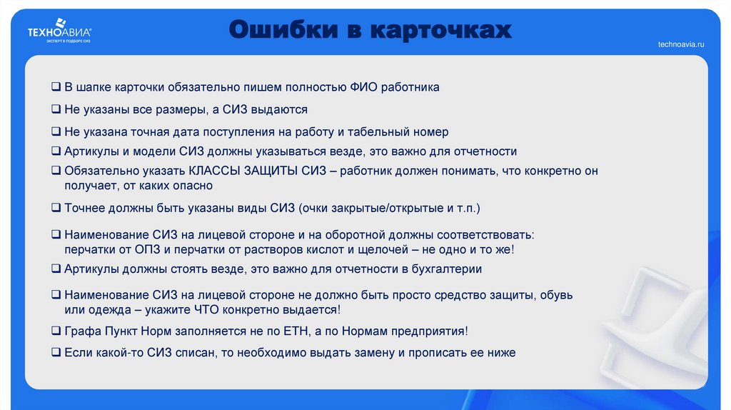 Ошибки в карточкахВ шапке карточки обязательно пишем полностью ФИО работника