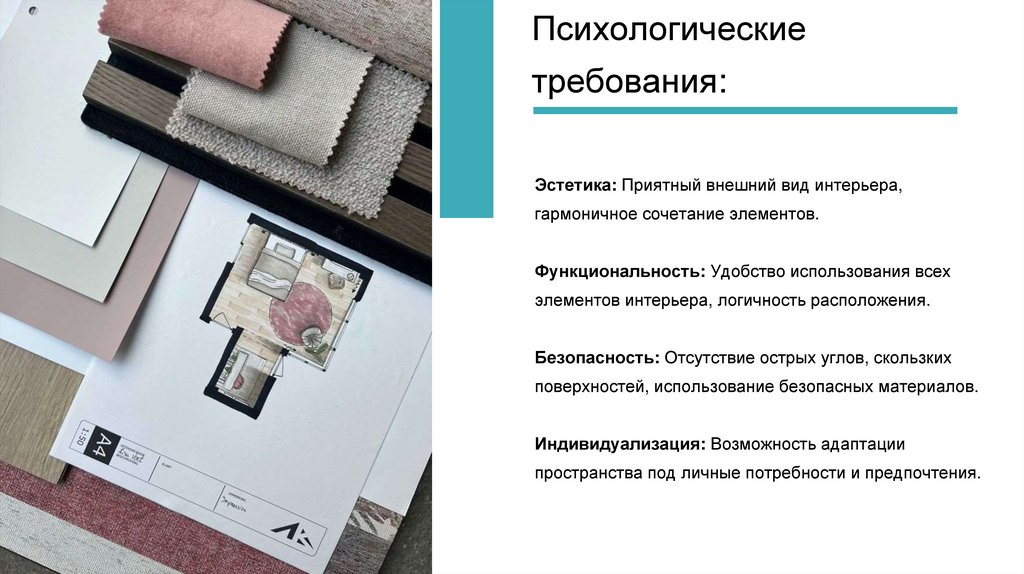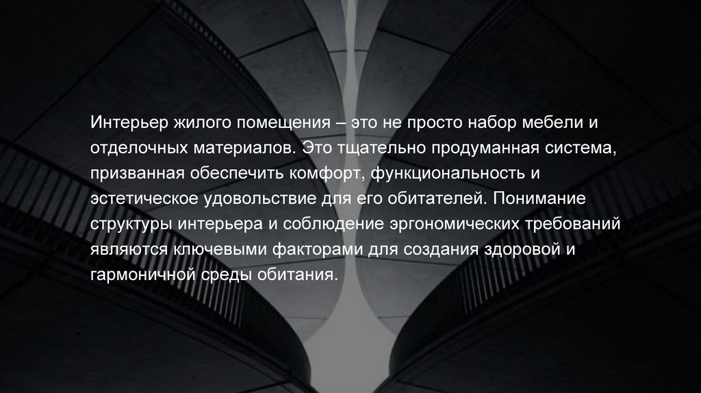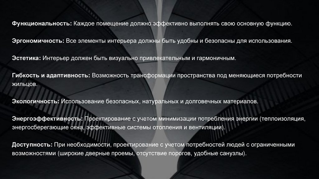 Функциональность: Каждое помещение должно эффективно выполнять свою основную функцию.Эргономичность: Все элементы интерьера должны быть удобны и безопасны для использования.