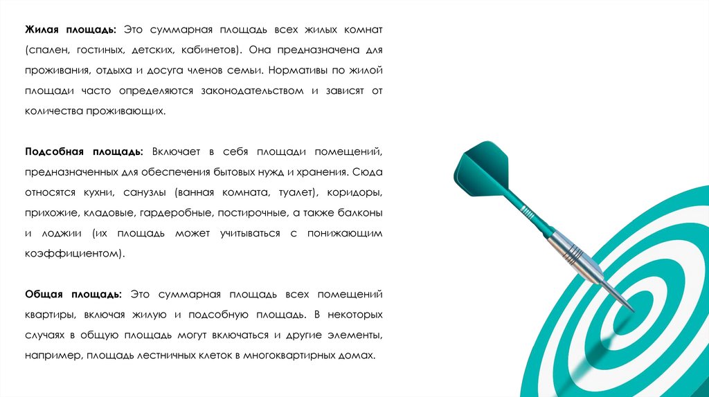 Жилая площадь: Это суммарная площадь всех жилых комнат(спален, гостиных, детских, кабинетов). Она предназначена для