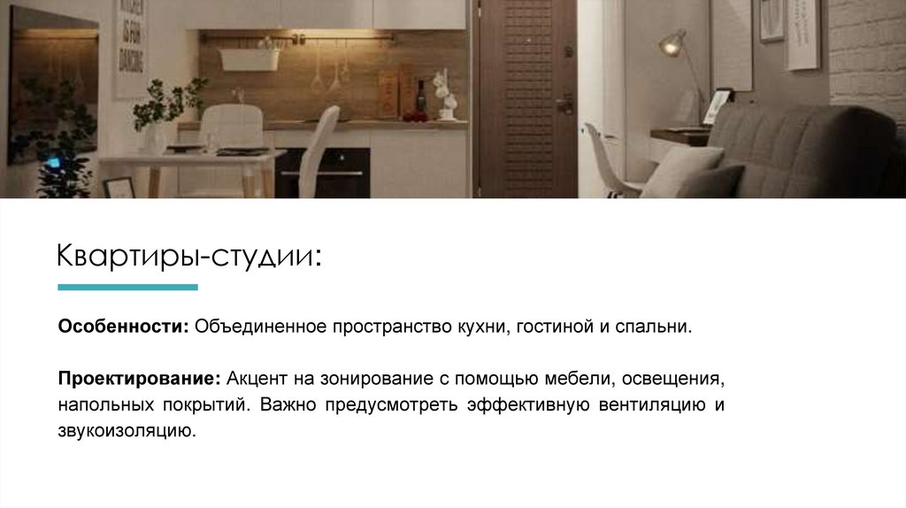Квартиры-студии:Особенности: Объединенное пространство кухни, гостиной и спальни.