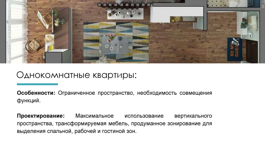 Однокомнатные квартиры:Особенности: Ограниченное пространство, необходимость совмещения