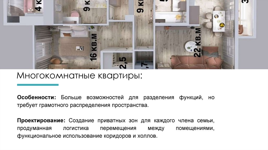 Многокомнатные квартиры:Особенности: Больше возможностей для разделения функций, но
