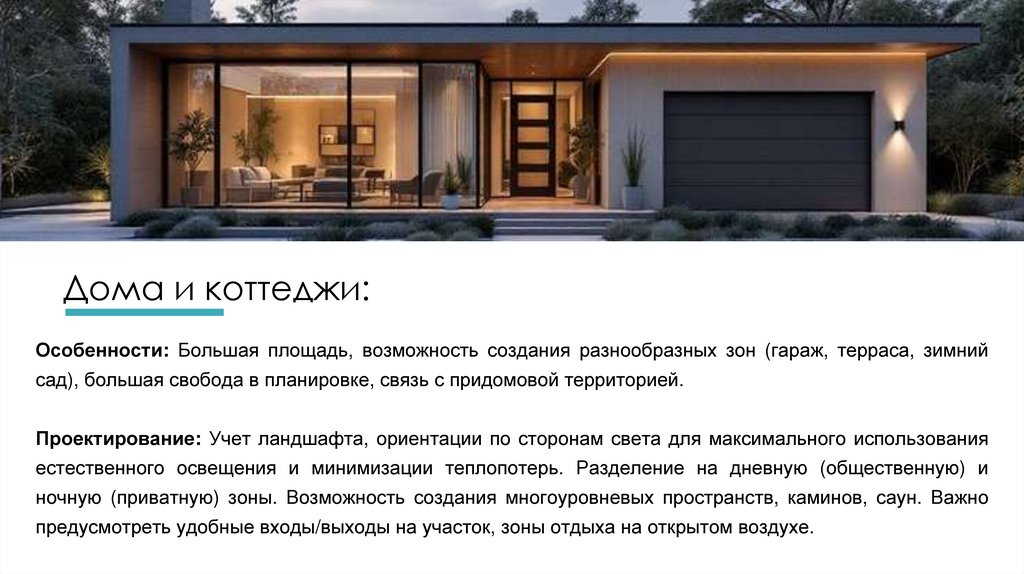 Дома и коттеджи:Особенности: Большая площадь, возможность создания разнообразных зон (гараж, терраса, зимний