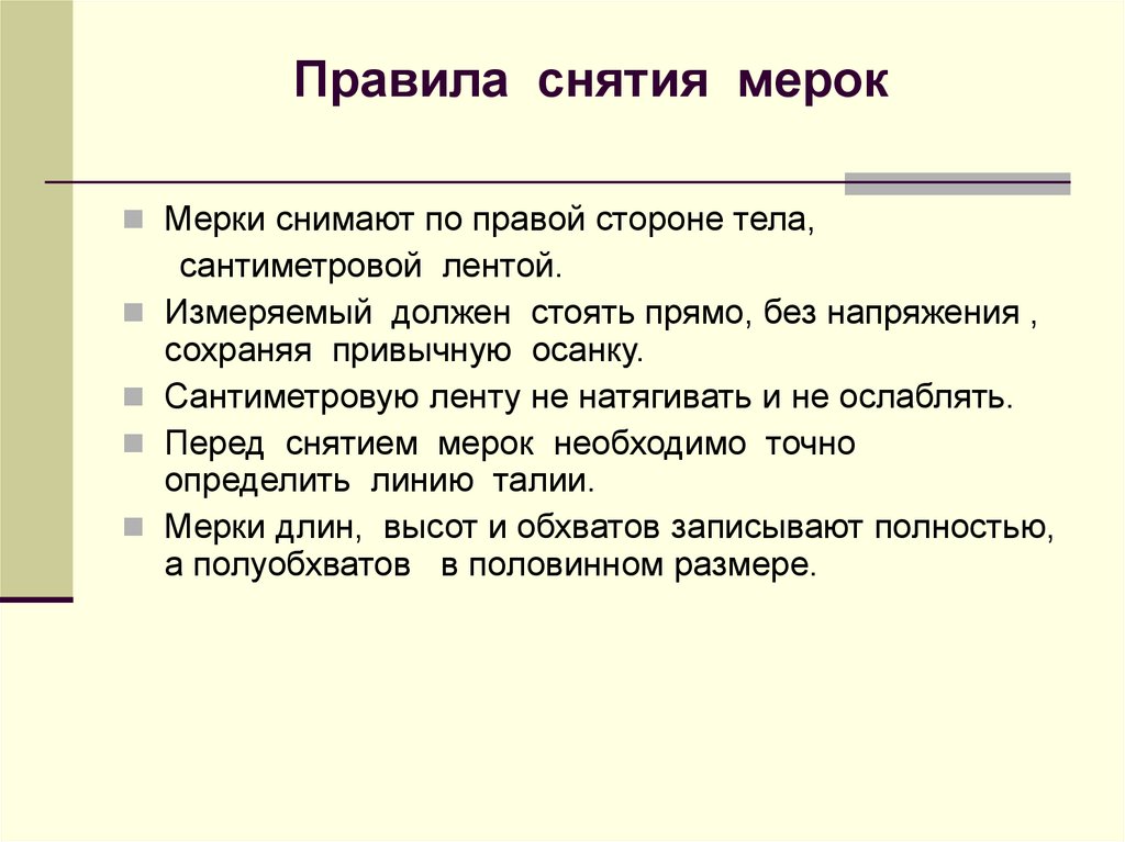 Правила снятия мерокМерки снимают по правой стороне тела,