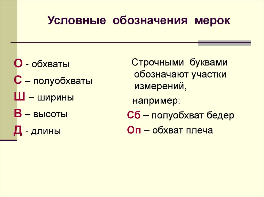 Условные обозначения мерокО - обхваты