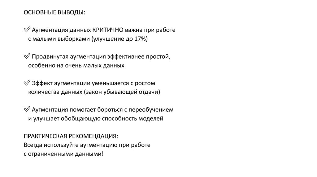 ОСНОВНЫЕ ВЫВОДЫ:✅ Аугментация данных КРИТИЧНО важна при работе