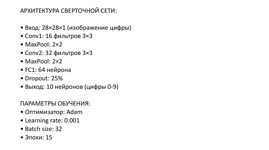 АРХИТЕКТУРА СВЕРТОЧНОЙ СЕТИ:• Вход: 28×28×1 (изображение цифры)